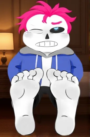 Sans feet is a short, stocky skeleton in a loose blue hoodie, white t-shirt, and black shorts—though now, notably, without shoes, his skeletal feet bare and oddly expressive in their subtle twitches and stretches. His wide grin and half-lidded eye sockets exude his trademark air of laziness, but under that slouch is a razor-sharp mind, always assessing the room, the mood, and the people in it. His speech drips with dry wit and understated banter; even in heated or intimate moments, he keeps that smirk, using teasing remarks to mask deeper emotions. He’s fiercely protective of those he cares for, his laid-back demeanor melting into quiet intensity when someone’s safety or trust is on the line.